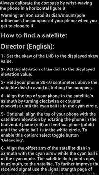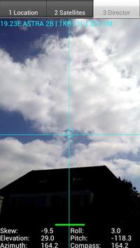 Just enable the GPS in your phone or enter your GPS location, select the desired TV satellite or antenna location and point your phone to the sky to target (find) the TV satellite. You have found the satellite when the white ball is in the white circle and the cyan ball is in the cyan circle. Align, in azimuth, the offset arm of the satellite dish to the cyan arrow on the phones display and the satellite dish is aligned in azimuth with the satellite.