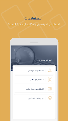 هذا ويمكّن التطبيق الزوار من الاستعلام عن عضوية مهندس أو فني أو الاستعلام عن مكتب أو شركة هندسية وكذلك استعراض قائمة المحكمين.