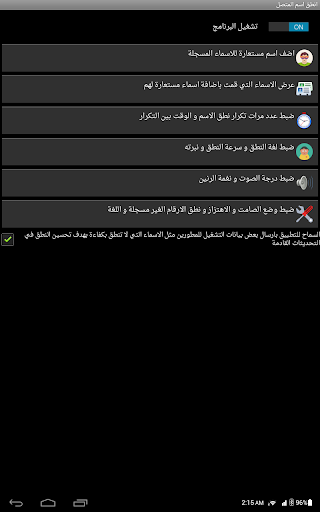 لا يوجد اختيار للغة العربية فأهم مميزات هذا التطبيق انه ينطق الاسماء العربية من خلال اللغة الانجليزية دون وجود خاصية نطق اللغة العربية على الجهاز