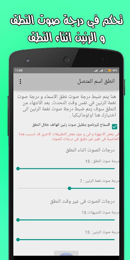 التطبيق يستخدم اعدادات الجهاز فى درجات و نوعية الصوت لذا فى حالة عدم النطق او انخفاض الصوت نرجو رفع صوت التنبيهات