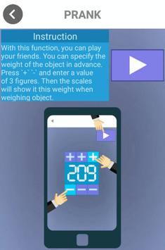 3. Prank - With this feature you can prank your friends. You can specify the weight of the object in advance. Press ` ` `-` and enter a value of 3 figures. Then the scales will show it this weight when weighing object.
