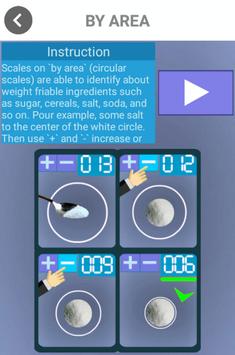 1. The balance of the area - The program can roughly determine the weight in grams of powdery ingredients such as salt, baking soda, sugar and so on. Pour example, some salt to the center of the white circle. Then use ` ` and `-` increase or decrease the diameter of a circle to the diameter of the salt. Scales show weight in grams of approx.