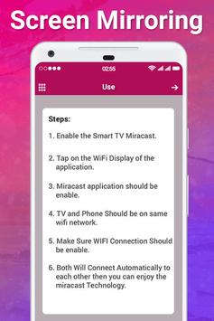 Screen Mirroring App will assist you to scan and mirror your android phone or tab's screen on smart TV/Display (mira cast enabled ) or Wireless dongles or adapters.