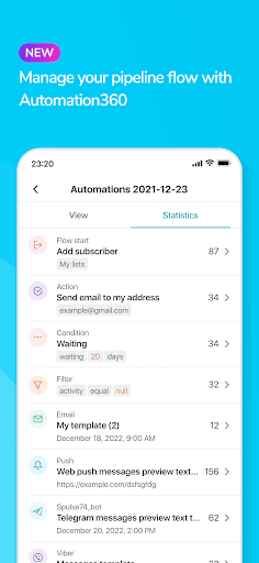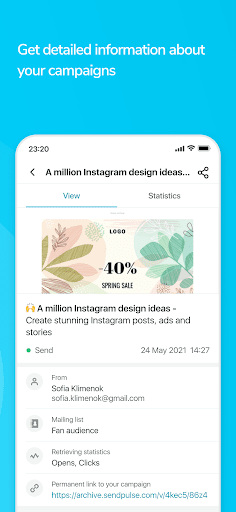 يتيح لك تطبيق SendPulse إضافة مشتركين إلى قوائمك وإرسال حملات البريد الإلكتروني وعرض التقارير والتحليلات التفصيلية.يمكنك إنشاء حملة على سطح المكتب الخاص بك وإرسالها لاحقًا من هاتفك أو جهازك اللوحي.أو يدويًا (عن طريق كتابة أو لصق عناوين البريد الإلكتروني)