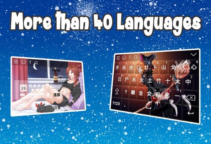 مثير الجلد لوحة المفاتيح أنيمي تتميز 7 مواضيع مذهلة، وأكثر من 40 لغة، وأكثر من 30 نمط الخط، مع هذا أفضل لوحة المفاتيح رموز تعبيرية يمكنك أن يخلق المواضيع الخاصة بك في "مجموعة صورتك" الخيار، واختيار أي صورة لديك من الهاتف الروبوت و ستحصل على "صور لوحة المفاتيح" أو يمكنك تعيين أي خلفيات تريد مثل ورق الجدران لوحة المفاتيح ...