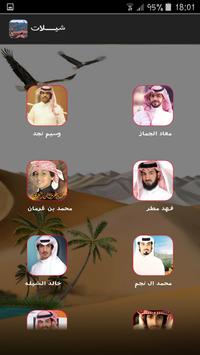 العديد من الشيلات الرائعة الجديدة للعديد من المغنيين مثل ماجد الرسلاني, عبدالعزيز العليوي, مهنا العتيبي, خالد الشليه, مشاري بن نافل, غزاي بن سحاب, شبل الدواسر, محمد ال نجم, فهد العيباني, عبدالاله العطاوي, مخلد الشراري, خالد المري العذب, عبدالله الطواري, عبدالكريم الحربي, سلطان البريكي, علي ال شقير, راجح الحارثي, فهد بن فصلا ...