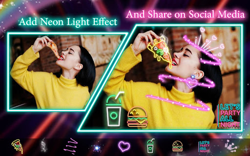نيون التحرير هو فكرة جديدة تماما واتجاه في عام 2020. تأثير النيون، دوامة النيون، فن النيون بالإضافة إلى ذلك. أنه يحتوي على علامات نيون مخصصة مثل علامات ضوء النيون المخصصة، وعلامات نصية نيون مخصصة، وتوججان نيون مخصص وأكثر من ذلك بكثير مع هذه الإضافة الإضافية. يحتوي محرر الصور النيون على بعض مزيج مضحك مثل إضافة العديد من الملصقات المختلفة المضحكة. ل Selfie Photo، إضاءة النيون، النيون الادمان لجعل الصورة مضحكة ومثيرة للاهتمام.