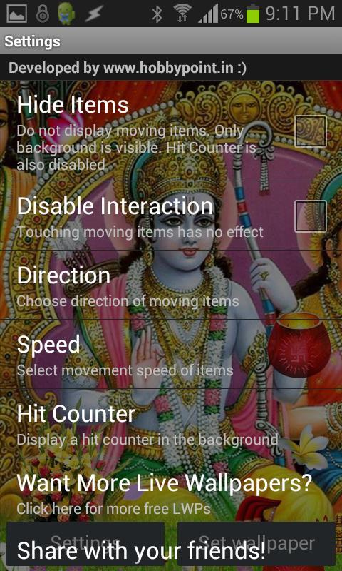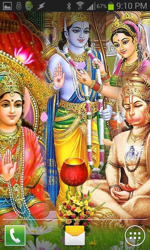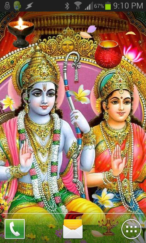 This is a beautiful high quality live wallpaper of Bhagwan Shri Rama and Sita. It features Lord Rama, Sita and Bakht Hanuman with shower of animated flowers, diyas and leaves.