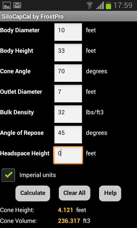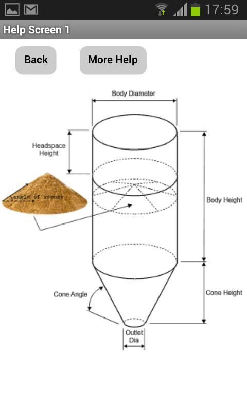 * للحصول على حسابات حجم التطبيق يتطلب قطر صومعة، ارتفاع، وقطره منفذ (صومعة إذا مسطحة القاع) وزاوية مخروط مع قطر مخرج (لالمخروطية منفذ صومعة). جميع الحقول غير المعتمد يمكن أن تترك فارغة أو مع مجموعة القيم 0.