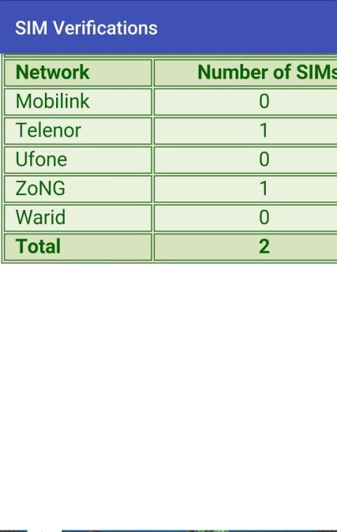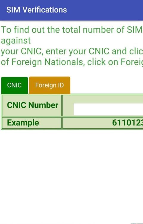 ومدقق SIM مع NIC التطبيق اقول لكم ان يتم تسجيل عدد سيمز مع بطاقة نادرة الخاص بك. باستخدام أداة سيم Varification من السهل جدا كما يحتاج المستخدم فقط إلى إدخال له أو لها نادرة varified رقم بطاقة الهوية. هذا التطبيق سوف يظهر الا في عدد المسجلين مع منطقة التجارة التفضيلية من خلال سيمز varified متري الحيوية.