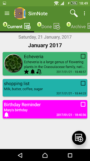 SIMNOTE (Simple Notepad) هو تطبيق Notepad و To-Do قوي وسهل الاستخدام يساعدك في تنظيم جميع مهامك اليومية، والقوائم المهمة، وقوائم التسوق وتذكر كل ما قد تنساه!