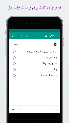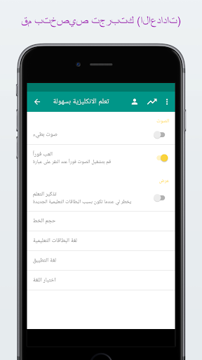 * قم بضبط اعدادات الاختبارات والبطاقات التعليمية من أجل الانكليزية -> العربية, العربية -> الانكليزية