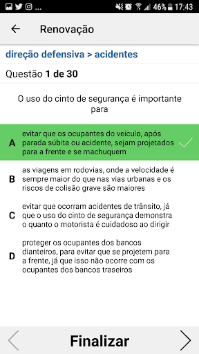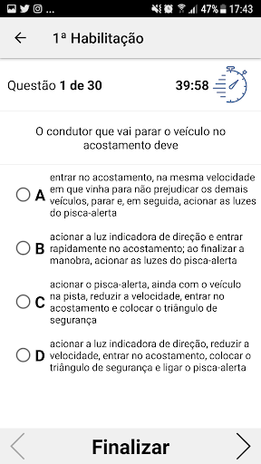 هل ستأخذ المؤهلات الأولى في ولاية ساو باولو؟اختبر معلوماتك حول المحتوى الذي تمت دراسته في 45 ساعة من الفئات النظرية مع DETRAN.SP محاكاة الرسمية.هناك 30 أسئلة خيار متعددة، تم اختيارها عشوائيا، والتي يجب الإجابة عليها في 40 دقيقة.ليتم اعتمادها، من الضروري أن تصل إلى 21 سؤالا على الأقل (70٪)، تماما مثل الفحص النظري الذي تم إجراؤه اليوم.