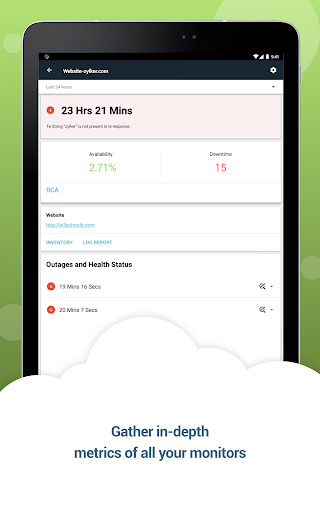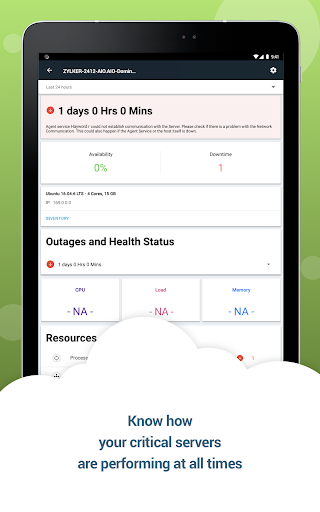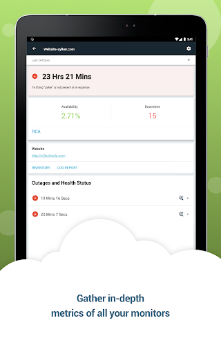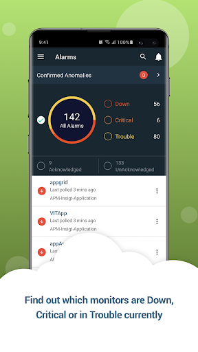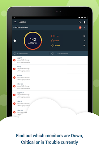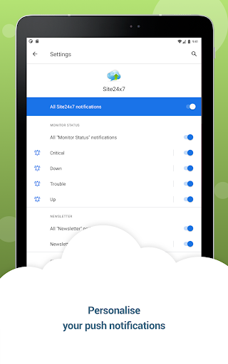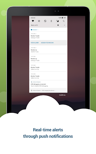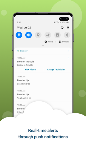 يرسل التطبيق تنبيهات فورية من خلال إشعارات الدفع إلى جهاز Android عند حدوث انقطاع.يمكن أن تكون التنبيهات في حالة انخفاض أو حرج أو في المتاعب (تخصيص كل حالة تنبيه ضمن الإعدادات) لمورد مراقبة موقعك 24x7 الذي سيحتاجتعليقات لمساعدة الفنيين في حل المشكلة بكفاءة.