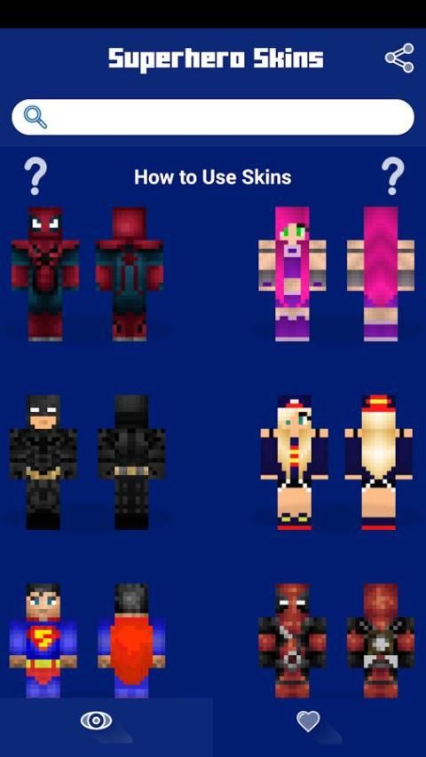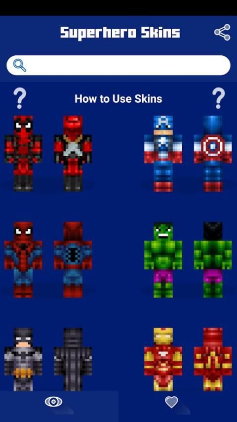 بطل جلود لماين كرافت PE FreeMCPE (طبعة الجيب) والجلد PC يسمح لك باختيار وتطبيق الجلد المخصصة لشخصية ماين كرافت الخاص بك مجانا مع مجرد لمسة زر واحدة! يمكنك أن تجد المفضلة لديك خارقة الجلد هنا! هناك طن تنته من جلود للاختيار من بينها، مع إضافة المزيد كل يوم! يمكنك محاولة الجلود الخاصة بك على جميع أنواع الخرائط: خرائط البقاء على قيد الحياة، والخرائط مغامرة، خرائط الإبداعية، خرائط باركور، الأحمر خرائط ستون وسائر الذي تريد! حتى أنهم يعملون مع أفضل اللاعبين يدخلون لحواسيب ماين كرافت - مثل: محظوظ كتلة زارة الدفاع، وزارة الدفاع يطير، Pixelmon وزارة الدفاع، وزارة الدفاع herobrine وكل تعديل والأخرى التي تريد.