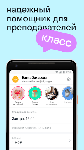 تطبيق لمعلمي المدرسة عبر الإنترنت باللغة الإنجليزية Skyeng (skyeng.ru)، حيث يمكنك إدارة الجدول الزمني الخاص بك، وتجديد المفردات وتجنيد الطلاب الجدد.