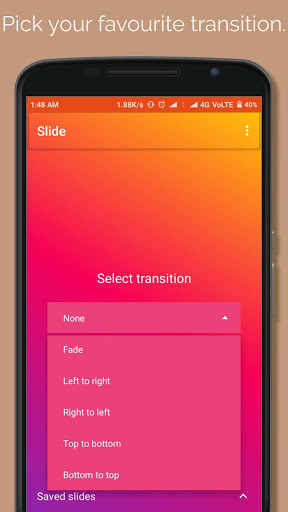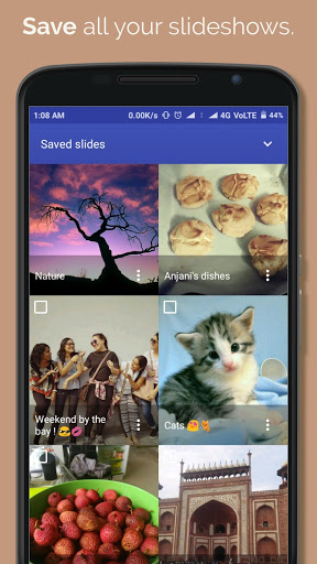Select your favourite photos, add your preferences and just sit back! Let Slide create beautiful slideshows for your home screen.