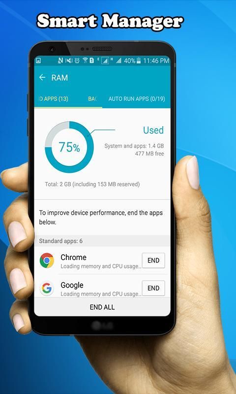 وقال مدير الذكي هو أفضل وسيلة رام نظافة لتحسين أداء ذاكرة الوصول العشوائي، وتسريع، مخبأ RAM النظيفة، وتنظيف الذاكرة، وقتل تطبيق الخلفية تماما وبدقة. وسوف تحل كل المواضيع RAM والأخطاء على النقر RAM نظيفة.