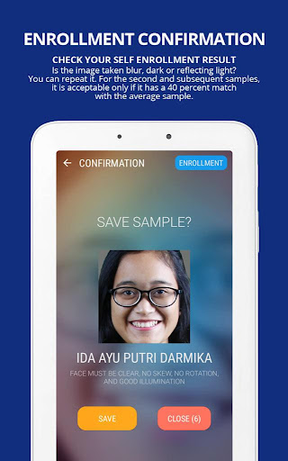 4.حاول تسجيل بيانات الحضور.اضغط على زر Enter Face إلى الكاميرا الأمامية للهاتف الذكي / الجهاز اللوحي.تأكد من ضوء الغرفة الكافي.