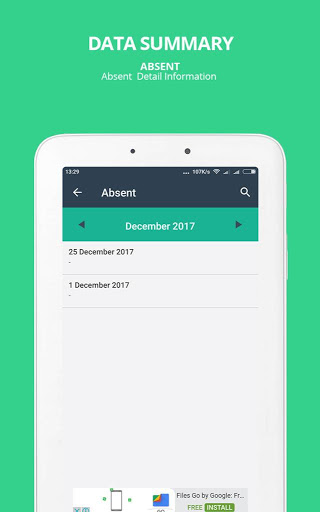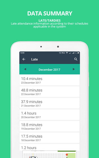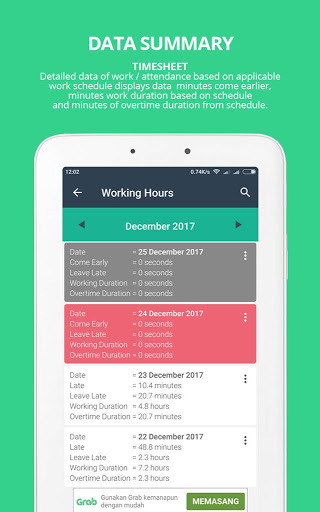 On the main menu this employee application displays employee data such as name, division, along with employee status. In addition, the main thing of this application is the display of the day's attendance hours in question, the history of attendance, the number of late, the number of absences, and long hours of work. This information can be seen in more detail at each date.