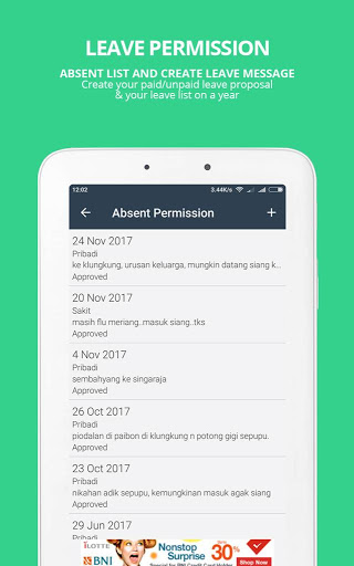 Another feature that is no less important than employee smartpresence is the leave submission feature that can be done through this application. And the status of confirmation when employees make leave requests or forget to make absences. There is also a settings menu for changing passwords, viewing pay slips and changing employee profile information.