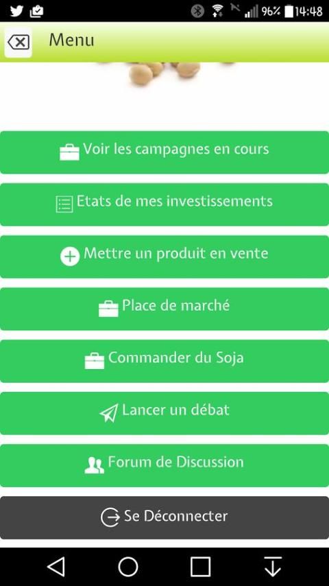 SOJA INVEST هو تطبيق المتنقلة التي تقدم خدمتين رئيسيتين تتعلق بتسويق الوصول في تسويق إنتاج فول الصويا وتمويل منتجي فول الصويا.