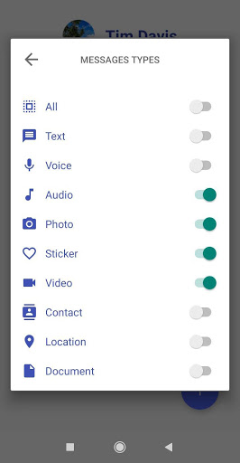 • مرشح حسب أنواع الرسائل (النص والصوت والصوت والصور والتصوير والملصقات والفيديو والاتصال الموقع والوثيقة)