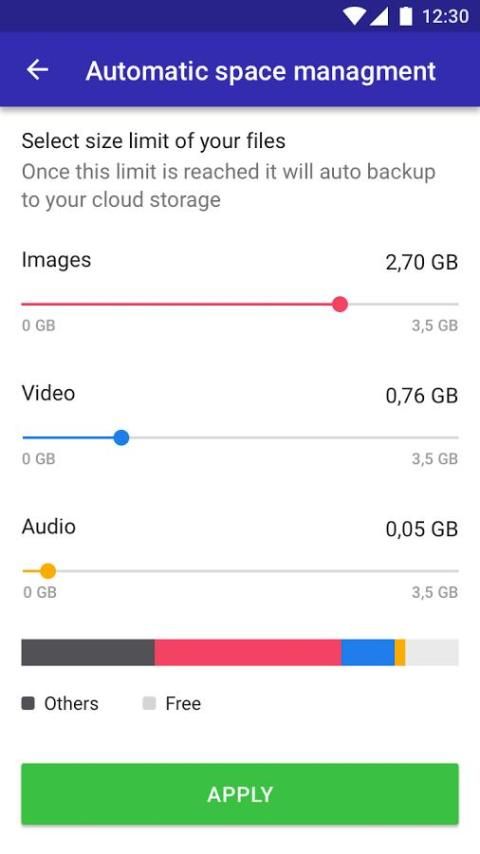 - إدارة المحتوى تلقائيا عن طريق اختيار حجم الصور / الفيديو / صوتيات لنسخ أو نقل إلى سحابة، ثم مدير الفضاء تلقائيا تحديد أقدم البيانات من الذاكرة الداخلية.