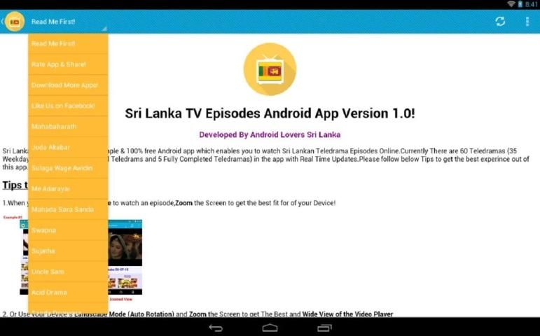 Sri Lanka TV Episodes is a very simple & 100% free Android app which enables you to watch Sri Lankan Teledrama Episodes Online.Currently There are 60 Teledramas (35 Weekdays Teledarams,20 Weekend Teledrams and 5 Fully Completed Teledramas) in the app with Real Time Updates!