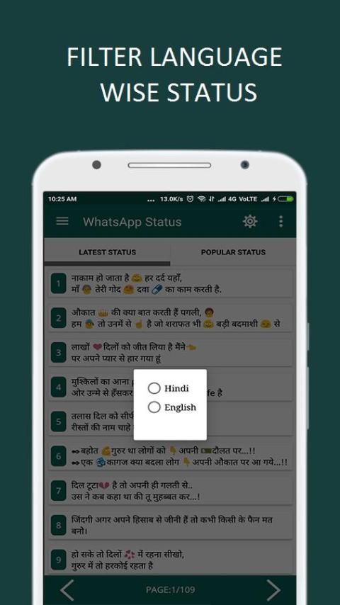 تحديثها بانتظام ويعطيك جرعة جديدة وطازجة يوميا من أحدث مركز لال WhatsApp، الفيسبوك، WeChat، الخط، فايبر، BBM وغيرها من منصات الشبكات الاجتماعية. مع سهولة الاستخدام وجودة الهندية، تصبح الحالة الإنجليزية جمع الجميع تصدير الراهن.