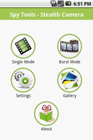 Fulfill your dream. Start Spying BUT use it for the betterment of society.Always dreamed of being a spy? Take a step forward to fulfill your dream by using Spy tools applications. With this app you can use camera for spying purposes. No one will come to know that you are capturing someone in mobile. With our no preview facility, person behind you won39;t come to know that you are using camera. This is a 15 day trial Features1. Widget optimized for spying.2. Burst mode. Take multiple pictures periodically.3. Single pic mode available. Widget supports both modes4. Customized gallery 5. Shutter sound onoff provision.6. No preview facility so that the person behind you cannot see that you are taking someone39;s pic.7. Blocked flash light. Does not support tabletThe app is tested on many phones, and supports all of them. But in case you come across any issue, mail us at contact@dexterltd.com. Our support team will help you out.
