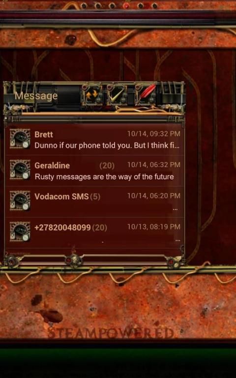 من الشاشة الرئيسية، مع GO المشغل السابق تثبيت - لونغ الصحافة مساحة فارغة على الشاشة الرئيسية - من القائمة المنبثقة الصنبور GoWidget - الشريحة اليمين أو اليسار ل"رسالة" - اضغط عليها - اضغط على أيقونة الطلاء على حق - حدد "Steampunk" - الشريحة عبر لاختيار واحد من العديد من الخيارات والأحجام.