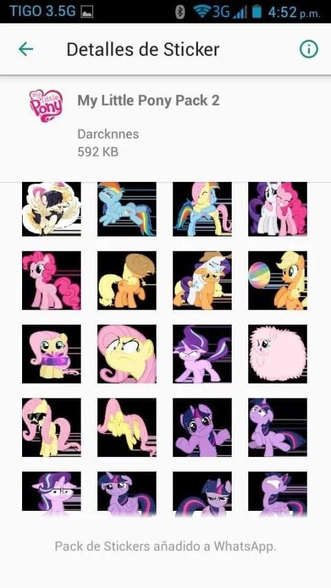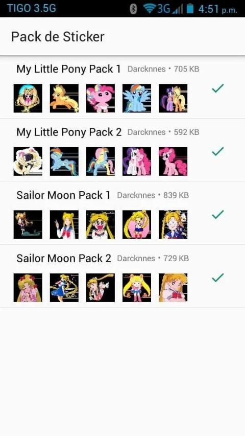 Assorted Pack of Stickers that has 2 folders of Sailor Moon and My Little Pony each, can be installed on any device that is compatible with the WhatsApp Stickers version, you can make your conversations something entertaining and expressive with these images without bottom, it is with pleasure and I hope you enjoy it> 3 <.