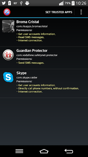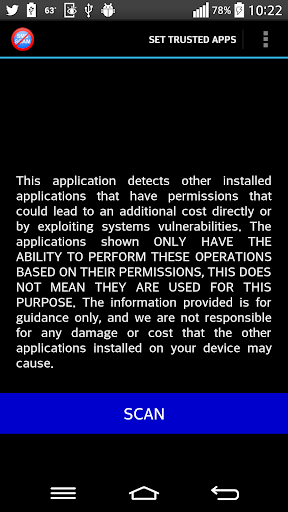 The purpose of this application is to detect applications installed on your device whose permissions might cause additional charges. Also displays a notification if the installation of a suspicious application is detected. (Active Protection).