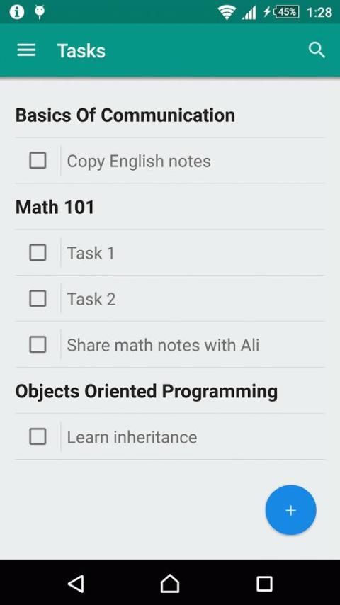 • التطبيق يشمل أيضا مدير المهام الأساسية التي يمكن للمستخدم استخدامها لإدارة مهمتهم. يمكن للمستخدم وضع علامة على المهمة كاملة كما أو لم تكتمل.