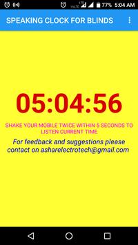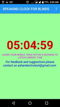 This app is intended to make time knowing easy specially for visually impaired persons and as well as for common people. App screen shows current time with a green background in hh:mm:ss format. On shaking device once screen colour changes to yellow and app waits for second shake for 5 seconds. If device is shaked twice within 5 seconds screen becomes blue and current time is spoken. Shaking twice feature is provided to prevent mis-trigging for speaking the time.