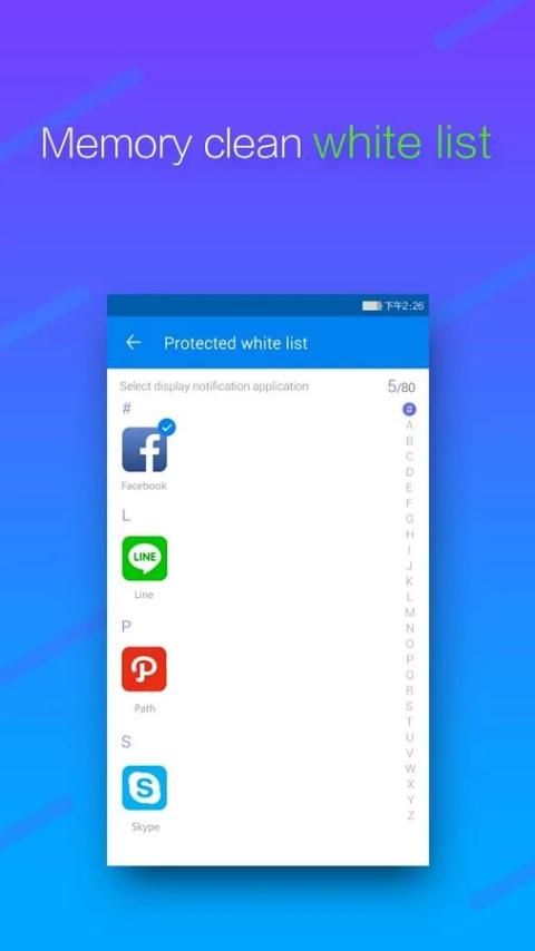 --Memory تنظيف القائمة البيضاء. يمكنك إضافة التطبيقات إلى ذاكرة القائمة البيضاء نظيفة لتجنب ترك شخص مهم.
