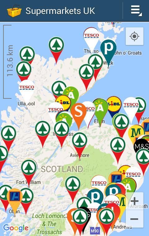 ويظهر هذا التطبيق محلات السوبر ماركت في المملكة المتحدة من كل السلاسل الكبرى على الخريطة، بما في ذلك العنوان ومواعيد العمل. كما يمكنك تحديد بسهولة عن طريق العلامة التجارية بحيث تظهر فقط مخازن من سلاسل السوبر ماركت المفضلة لديك ما يصل.