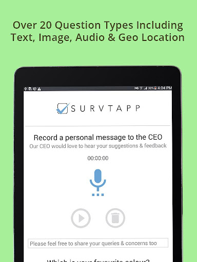 SurvTapp هو تطبيق مسح يتيح لك جمع أي نوع من البيانات على الأجهزة اللوحية والأجهزة المحمولة وأكشاك الشاشة التي تعمل باللمس & amp ؛ الويب لإجراء الدراسات الاستقصائية في أي وقت وفي أي مكان.