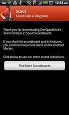 Team Fortress 2 - Scout Soundboard! Dozens of sound clips from the Scout. Team Fortress 2 - Scout Soundboard! Dozens of sound clips from the Scout, of the classic FPS TF2. Set any of the clips as a ringtone, notification, or alarm sound. You can also save the sound files directly to your sd card and clear any unused data saved by the app with a single click.
