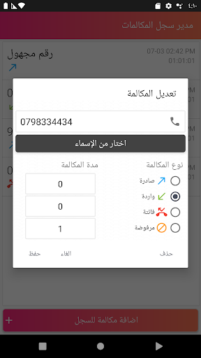 يمكنك تعديل الوقت والتاريخ والمدة ونوع المكالمة ورقم الهاتف لأي مكالمة في السجل.