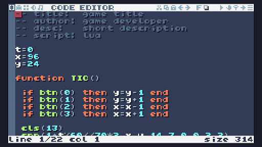 TIC-80 هو كمبيوتر خيالي لصنع ألعاب صغيرة ومشاركتها.هناك أدوات مدمجة للتنمية: الكود والإصدارات والخرائط ومحرري الصوت وسطر الأوامر، وهو ما يكفي لإنشاء لعبة رجعية صغيرة.عند الخروج، ستحصل على ملف خرطوشة، والتي يمكن تخزينها ولعبها على الموقع الإلكتروني.أيضا، يمكن أن تكون اللعبة معبأة في لاعب يعمل على جميع المنصات الشعبية وتوزيع كما يحلو لك.لجعل لعبة مصممة على غرار الرجعية، تتم عملية الإبداع بأكملها تحت بعض القيود التقنية: عرض 240x136 بكسل، 16 لوحة ملونة، 256 8x8 Color Sprites، صوت 4 قناة وما إلى ذلك.
