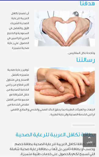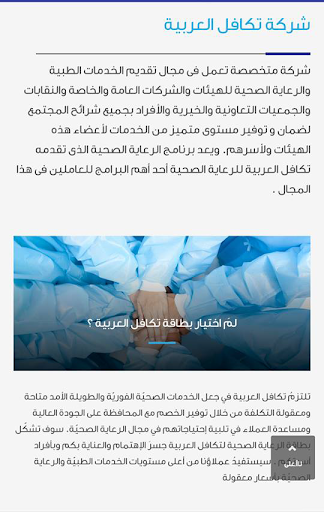 تكافل العربية : شركة متخصصة تعمل فى مجال تقديم الخدمات الطبية والرعاية الصحية للهيئات والشركات العامة والخاصة والنقابات والجمعيات التعاونية والخيرية والأفراد بجميع شرائح المجتمع لضمان و توفير مستوى متميز من الخدمات لأعضاء هذه الهيئات ولأسرهم. ويعد برنامج الرعاية الصحية الذى تقدمه تكافل العربية للرعاية الصحية أحد أهم البرامج للعاملين فى هذا المجال.