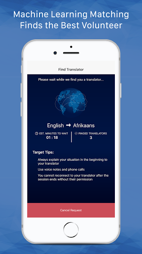 2 - اللاجئون وعمال الإغاثة اشترك ويطلبون مترجما بناء على احتياجاتهم (مثل مقابلات اللجوء أو طب الطوارئ أو التنقل إلى بلد جديد أو أي حاجة إنسانية). يستخدم Tarjimly Machine Learning to Connect لهم أفضل مترجم متاح في ثوان.