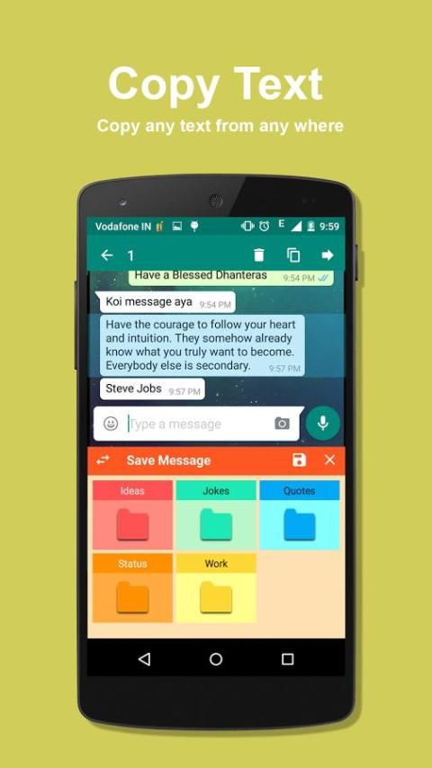 Texa revolutionizes the saving and sharing of text, messages, URLs, address, quotes inside any famous social messaging app, browser, utility apps (Whatsapp, Facebook, Messenger, Chrome, Keep, Wechat, Line, Hike, Tango, Telegram, Imo, Viber and many more) without closing app. It is fast and saves a lot of valuable time.