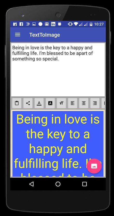 النص إلى صورة هو التطبيق للكتابة في طريقتك الخاصة رسالة ومن ثم تحويله إلى صورة. في هذا التطبيق تجد الكثير من الخيارات لجعل صورتك رائعة. أولا إرسال رسالة أو يمكنك بسهولة لصق رسالة نسخها هنا لتحويله إلى صورة. هنا يمكنك الحصول على خيار لصق، حصة، ولون النص ولون خلفية النص، حجم النص، والمحاذاة وحجم الحدود ولون.
