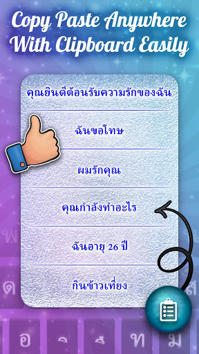 هل تساءلت يومًا عن كيفية كتابة اللغة التايلاندية على نظام Android؟ يتيح لك تطبيق لوحة المفاتيح الإنجليزية الكتابة بسهولة باللغة التايلاندية الأصلية. يعد تطبيق الكتابة السريعة هذا أداة جديدة إذا كنت تريد الكتابة أو الترجمة أو البحث أو إرسال رسائل البريد الإلكتروني أو كتابة المنشورات أو المدونات أو الدردشة أو المشاركة مع أصدقائك على الشبكات الاجتماعية.
