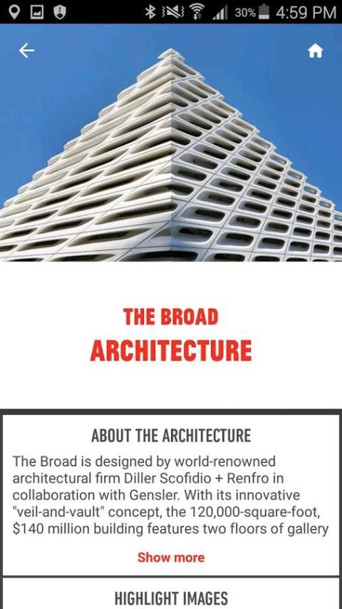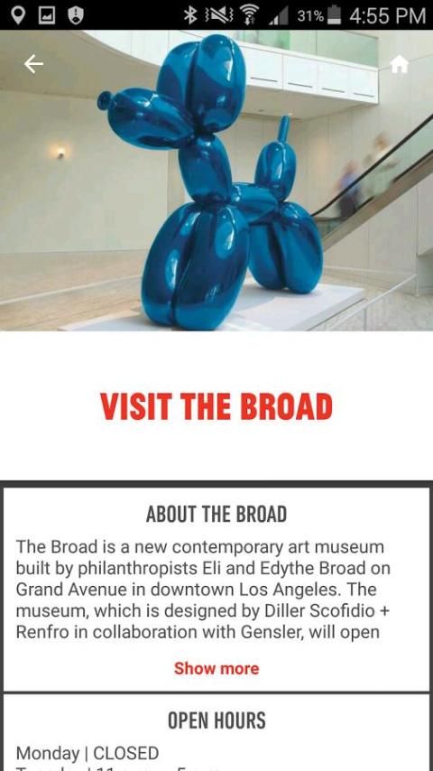 The Broad’s free mobile app was developed to enhance the museum experience by offering audio, video, and descriptive text about the collection, artworks and artists on view, as well as free self-guided audio tours. Visitors also can use The Broad’s free mobile app to reserve, view, and redeem their museum tickets.