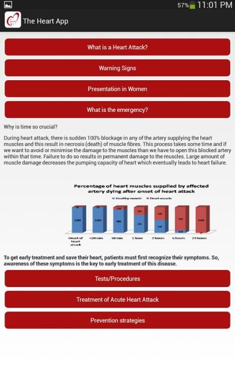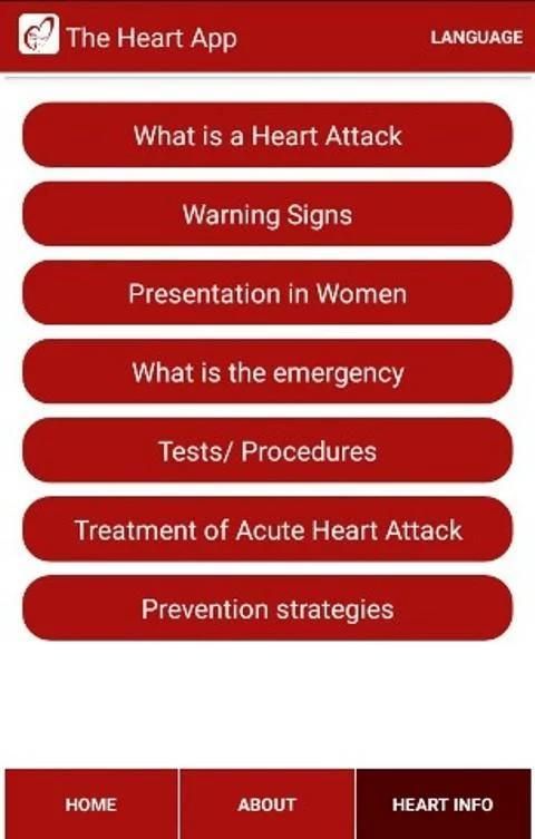 The heart app uses questions utilized by heart specialists to diagnose whether the pain or discomfort in your chest, shoulder, jaw or back could be heart attack or some of its warning signs. The app also contains information about heart attacks and coronary artery disease packed in practical and easy to read compartments.