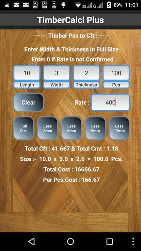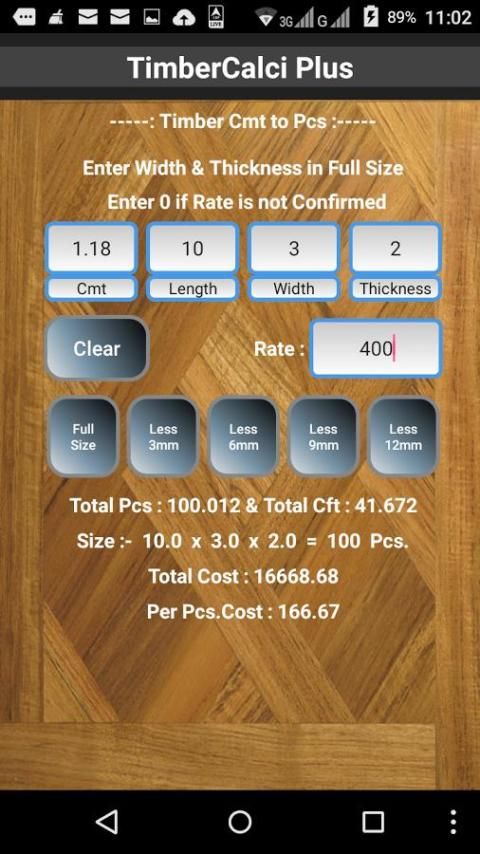 > فقط ادخل الحجم الكامل للأخشاب واضغط على الزر المطلوب لحساب. (أي حجم كامل، أقل 3MM، أقل 6MM، أقل 9MM، أقل 12mm) و